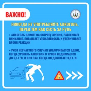 Никогда не употребляйте алкоголь, перед тем как сесть за руль. Вам необходимо выбрать: либо пить, либо вести машину. Каждое пятое происшествие на дорогах России связано с управлением транспортным средством в состоянии опьянения.
