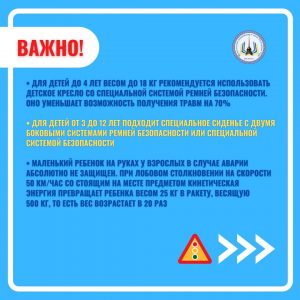 • Для детей до 4 лет весом до 18 кг рекомендуется использовать детское кресло со специальной системой ремней безопасности. Оно уменьшает возможность получения травм на 70%.