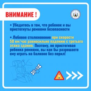 • Лобовое столкновение при скорости 50 км/час равносильно падению с третьего этажа здания. Поэтому, не пристегивая ребенка ремнями, вы как бы разрешаете ему играть на балконе без перил!